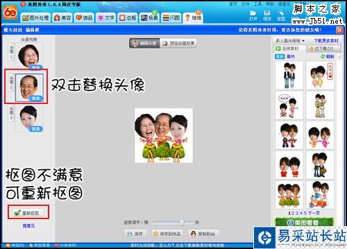 選擇“娃娃”分別對全家人的頭像進行摳圖,完成后開始編輯頭像,這里可以調整頭像的位置,搖動的速度,如果覺得不滿意還可以重新摳圖、替換頭像,完成后就可以預覽效果并保存了!