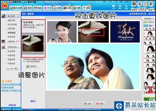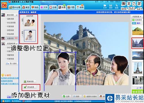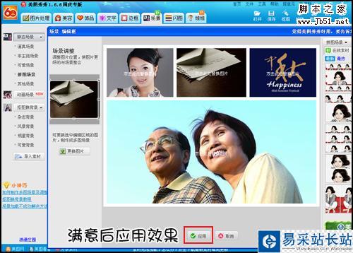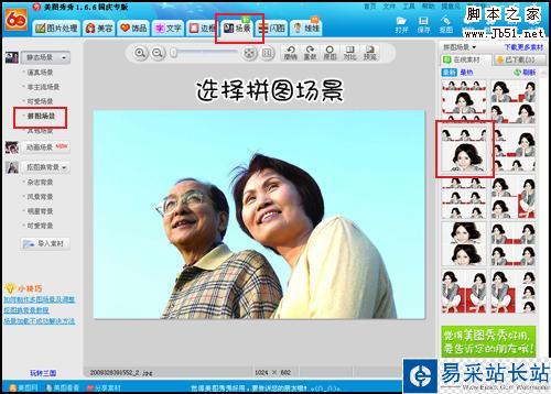 制作方法非常簡單,用美圖秀秀打開照片后選擇“場景”——“拼圖場景”,在場景編輯框選擇自己喜歡的場景雙擊更改圖片,然后調整圖片,滿意后選擇“應用”就完成了。