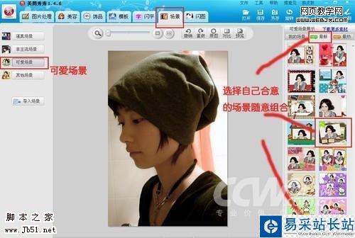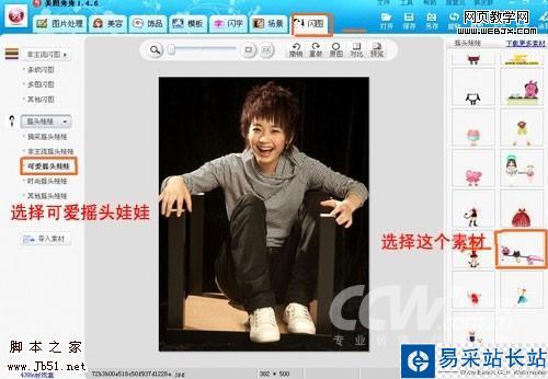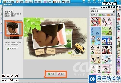 你會發現彈出來一個對話框,你在這里可以調整圖片在場景中的位置,大小,以及可在右邊替換場景,這個要看你個人的感覺了,我稍微移動了一下上下位置,然后點擊“應用”,最原始的效果出來了。不過還需要加一些點綴進來。替換到“飾品”場景,選擇“用戶自定義”,你會發現剛剛做的欣寶版本搖頭娃娃就在這,點擊娃娃,她就出現在圖像中了,調整好位置。我把她放在右上角,如圖
