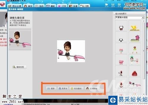 選擇“可愛搖頭娃娃”,選中其中一個“素材”點擊,這個時候會出面一支鋼筆形狀的鼠標箭頭,你需要控制鼠標,對著她的頭像,圈住你想要留下的部位,如果覺得圈的不好,就點“重新扣圖”,直到你滿意為止。下圖是扣完圖后的樣子,這部分就是搖頭娃娃的頭部了,下邊的部分是軟件自帶的樣式,可任你挑選。