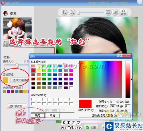 染發編輯框中默認顏色中沒有紅色。但是我們可以點擊“選擇其他顏色“,在顏色選擇器中選擇紅色。如圖3所示。