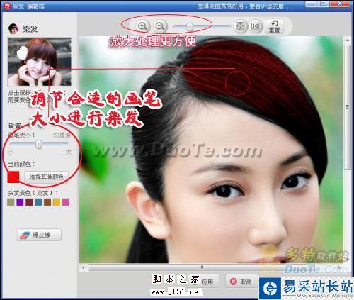 調節畫筆顏色,即可對頭發進行染色。為了染發效果自然,所以要注意邊緣著色。可以選擇放大處理。如圖4所示。