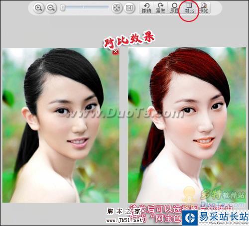 這樣就可以瞬間預覽自己染發的效果啦。不過“美圖秀秀”軟件不但可以染發,還有圖片效果的一鍵處理,比如圖6中的右側效果圖就加了“圖片處理”標簽下的“時尚—阿寶色”。