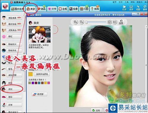 打開一張MM照片,固然黑發也很漂亮,但是為了快樂過圣誕,給頭發來點顏色,會讓美上加美!直接進入“美容—染發”功能。如圖2所示。