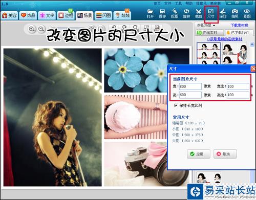 圖簽做好之后肯定是要上傳到論壇或QQ空間的了,但是很多時候上傳圖片有尺寸、大小的限制,大家還要知道怎么改變圖片的大小,修改起來也非常的簡單。當做好圖簽后,只要在美圖秀秀界面的右上方點擊“尺寸”功能,就可以在編輯框中按照需求進行尺寸修改。