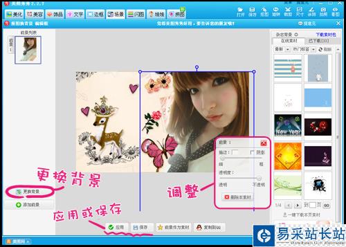 3、最后依據個人的喜好,你可以選擇美圖秀秀素材庫中自帶的背景,也可以點擊“更換背景”的按鈕,用自己平時喜歡的背景來更換哦!