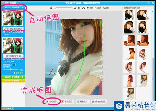 2、在摳圖編輯框中選擇方法一“自動摳圖”,首先點擊“啟用摳取前景筆”以綠色的畫筆在你想要摳取的前景上劃線,摳取完畢后,再點擊“啟用刪除背景筆”以紅色的畫筆在選區中將你誤選取的區域是劃線,直到前景選區是你滿意的效果為止。