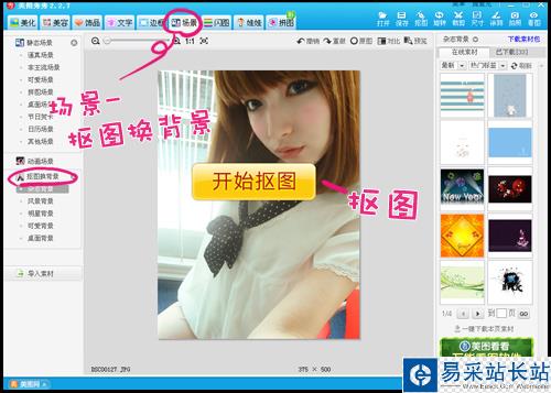 1、進入美圖秀秀軟件界面,打開原圖,選擇菜單欄“場景”下的“摳圖換背景”功能,點擊“開始摳圖”按鈕,進入軟件的摳圖編輯框界面。