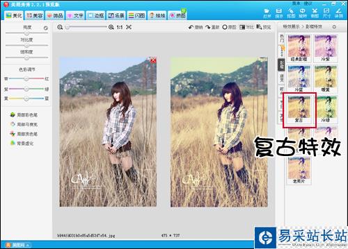 4.再來點更深入的,先在原圖的基礎上加些特效試試。小編嘗試的是“復古”特效,看上去是舊舊的的感覺。