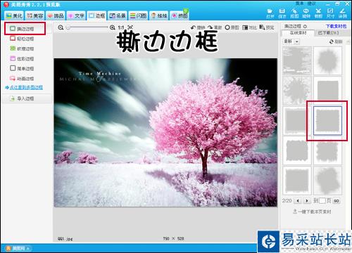 1.先來一個最簡單最小白的操作,選擇美圖秀秀的“邊框”菜單下的“撕邊邊框”,在右側的素材庫中選擇一個喜歡的效果。
