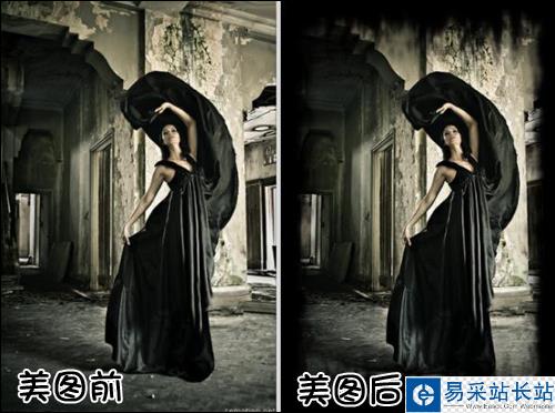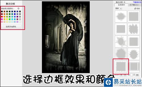 3.再來點復雜點的。“撕邊邊框” 默認的顏色是白色,但在左側的“色彩庫”里可以調整邊框的不同顏色。對于暗色調的圖來說,使用白色會起到很大的沖突,很不合適,而選擇相應的黑色調就很自然的融圖成功,相對于原圖,這樣更具有“哥特”風格!
