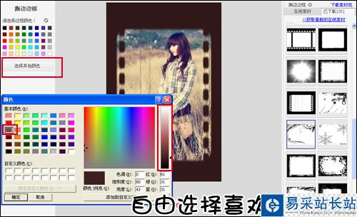 5.還是老樣子選擇喜歡的邊框素材和顏色,小編沒有用默認的色塊,而是點擊“選擇其他顏色”,這也是美圖秀秀為了方便大家不同需求而設計,任何顏色都可選。小編先選擇了一個“咖啡”色塊,色彩有點僵硬,可以涌過右側的色帶來調節明暗,向下加深黑色就變成了現在看到的深咖啡色,還可以直接選擇顏色數值哦!
