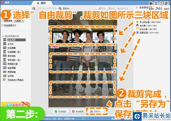 2.選擇“自由裁剪”,將頭部、腰部以及腳部三塊區(qū)域等寬裁剪出來(lái),裁剪完成后將素材保存好。