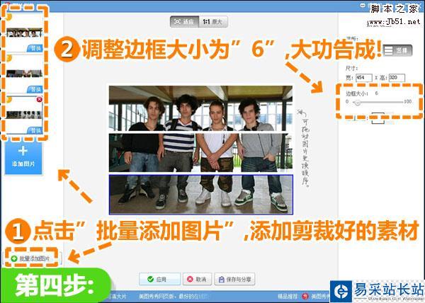 4. 點(diǎn)擊“批量添加圖片”添加剛才裁剪好的三塊區(qū)域,調(diào)整邊框大小為“6”,點(diǎn)擊“保存與分享”就可以及時(shí)將照片分享給好友啦!