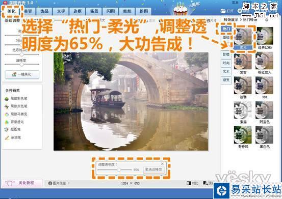 4、最后選擇“熱門-柔光”特效,調(diào)整透明度為65%,就大功告成啦!