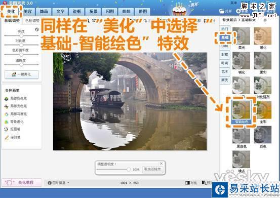 2、接下來就是調(diào)整色調(diào),選擇“基礎(chǔ)-智能繪色”特效,讓畫面色彩明艷。