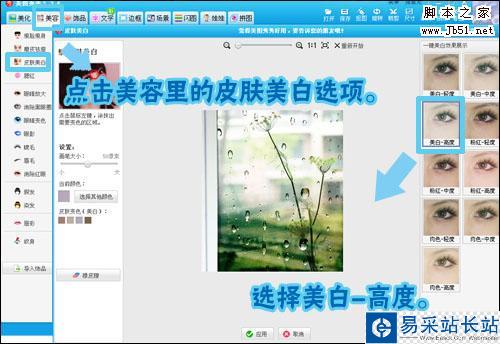 4.圖片合成之后,變的有些灰暗。不要緊,我們進入“美容”菜單下,在“美白”功能里選擇“美白-高度”。這樣就能一鍵解決色調灰暗的問題。記得修改后點擊應用按鈕哦!