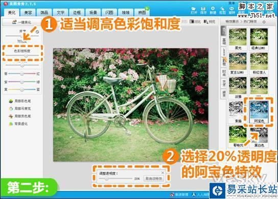2、點擊“熱門”特效分類,選用透明度為20%的“阿寶色”特效。并適當調高照片色彩飽和度,使照片顏色亮麗。