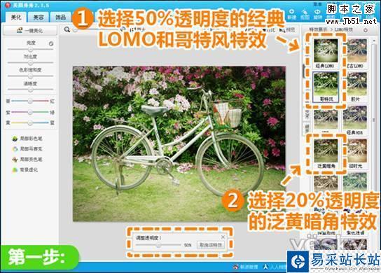1、在“美圖秀秀”中打開隨拍照片。先使用透明度為50%的“經典LOMO”、50%的“哥特風”特效,然后再使用一個透明度為20%的“泛黃暗角”特效。