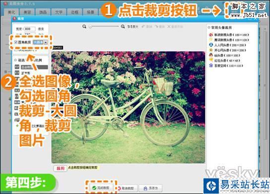 4、點擊“裁剪”按鈕,在彈出的“裁剪”編輯框中勾選“圓角裁剪?大圓角”,全選圖像進行圓角裁剪。