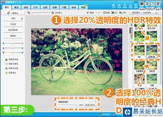 3、在“LOMO”特效分類中,分別使用透明的為20%的“HDR”和100%的“經典HDR”特效,為圖片帶來明暗對比效果。