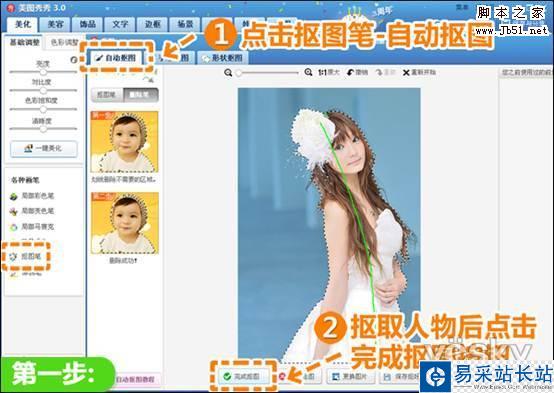 1、在“美圖秀秀”軟件下打開照片。點擊“摳圖筆”,選擇“自動摳圖”摳取人物后,點擊“完成摳圖”按鈕。