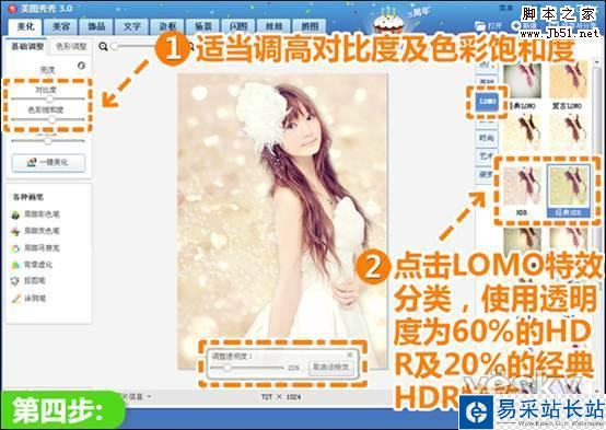 4、點擊“LOMO”特效分類,使用透明度為60%的“HDR”以及20%的“經典HDR”特效。并適當調高照片對比度及色彩飽和度,讓照片色彩更靚麗。