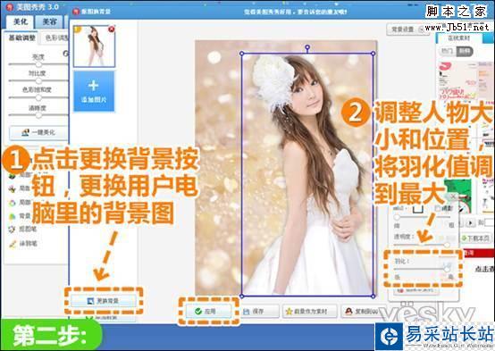 2、在彈出的“摳圖換背景”編輯框中點擊“更換背景”按鈕,更換自己喜歡的背景素材圖片。再調整人物在背景中的位置和大小,并將羽化值調到最大,讓人物與圖片融合的更自然。