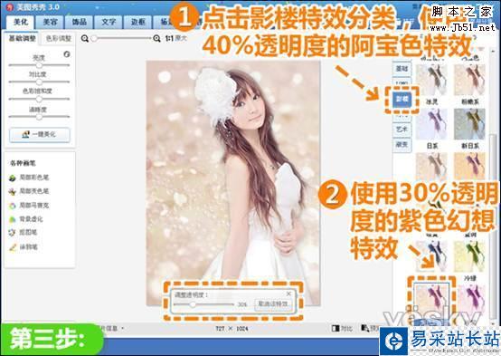 3、回到“美化”菜單下,點擊“影樓”特效分類,使用透明度為40%的“阿寶色”以及30%的“紫色幻想”特效,讓照片整體呈現夢幻感覺。