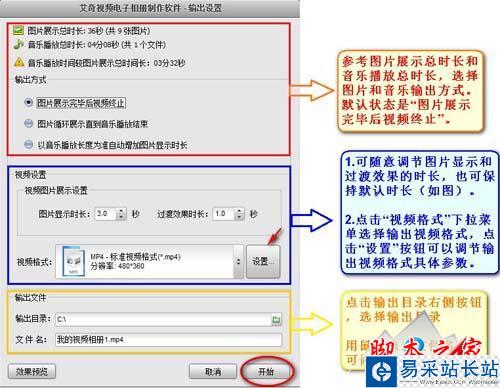 可以選擇輸出方式、圖片展示與視頻格式、輸出文件目錄和文件名,也可以保持軟件默認設置,設置完成之后,點擊開始按鈕,即可完成制作。