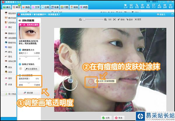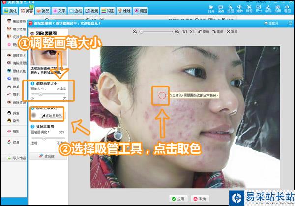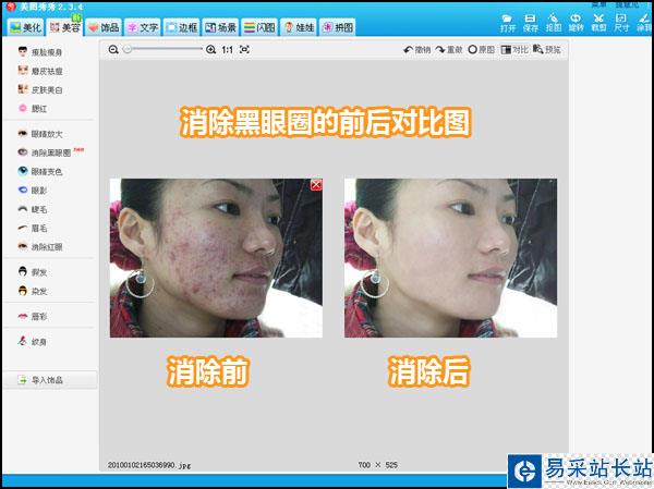 因為這個美女的痘痘非常嚴重,前兩個步驟可能無法根除,這個時候我們需要借助于“消除黑眼圈”的功能。先來看看利用“消除黑眼圈”功能消滅痘痘前后的對比圖吧: