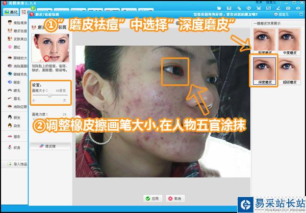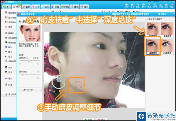 第一步:打開原圖后,到“美容”標簽下選擇“磨皮祛痘”功能中,選擇一鍵“深度磨皮”。再調整橡皮擦的畫筆大小,在眼睛、嘴巴、頭發等地方涂抹,還原這些不需要磨皮的部分細節。