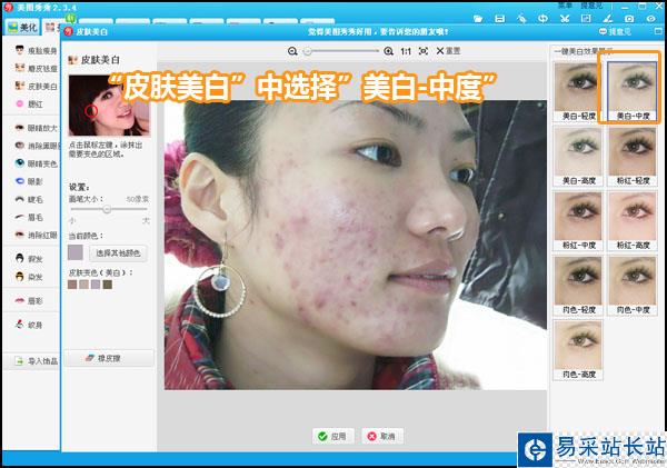 第二步:現在發現MM的皮膚比較光滑了,接著到“皮膚美白”功能里選擇“美白—中度”,提亮MM的膚色。