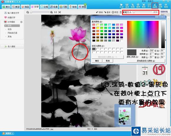 10、這一步是用戶很用心做的一個技巧,用“涂鴉”功能給荷花的花莖點上逼真的節(jié)點,非常細(xì)心!這里選用的顏色是自定義的“黑灰色”,也非常符合水墨畫的色調(diào)。