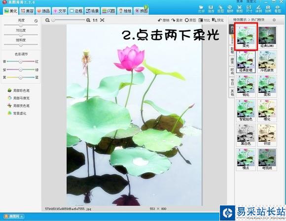 2、選擇“美化”菜單下的“熱門”特效,點擊“柔光”,使用2次。