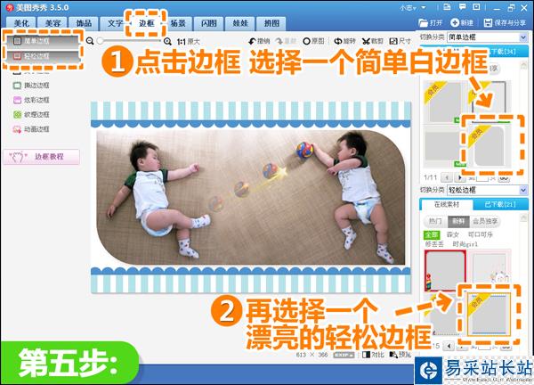 5、然后進入“邊框”菜單下,先在“簡單邊框”分類下選擇一個對稱圓角白邊框,再從“輕松邊框”分類中找個裝飾性邊框。