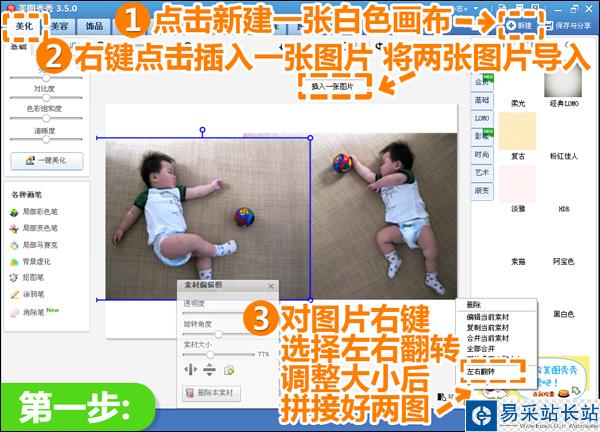 1、在“美圖秀秀”軟件下,點擊“新建”按鈕建立一張大小適宜的白色畫布,對畫布右鍵選擇“插入一張圖片”,將要拼接的兩張寶寶照片導入進來,有需要的可以右鍵選擇“左右翻轉”,然后調整好大小位置。