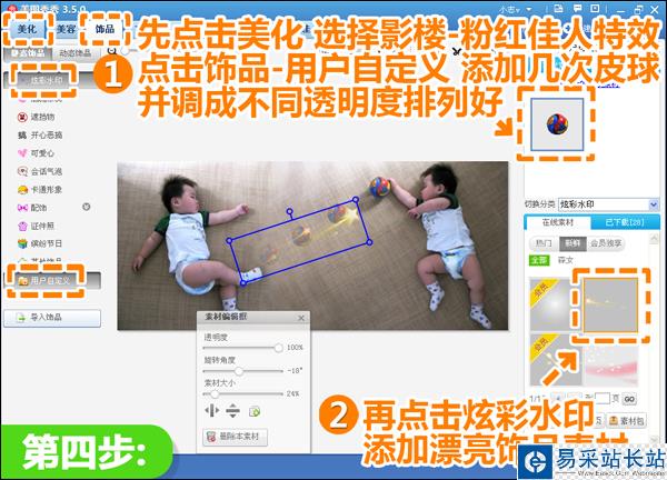 4、先在“美化”菜單下,選擇“影樓—粉紅佳人”特效微調色調。再進入“飾品”菜單下,在“用戶自定義”中找到并添加皮球素材,在寶寶的腳和手之間添加多個皮球,調節透明度打造漸進的效果。然后在“炫彩水印”分類中找一些裝飾素材添加到圖片中。