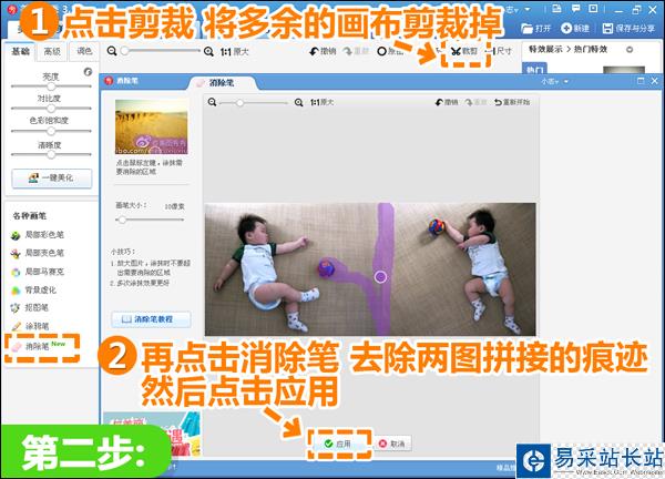 2、仍在“美化”菜單下,先點擊“剪裁”,將多余的畫布剪裁掉。然后再點擊“消除筆”,來去除一個皮球和兩圖拼接的不自然痕跡。