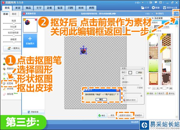 3、接著點擊“摳圖筆”,選擇用“形狀摳圖”中的圓形來摳取皮球,跳轉到換背景界面后,點擊“前景作為素材”將摳好的皮球存入“飾品—用戶自定義”中備用。然后關閉此編輯框返回上一步的狀態。