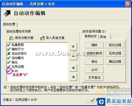 這樣操作后,以后使用該方案處理照片就不會產(chǎn)生光影魔術手的LOGO了,是不是很簡單?同理,要去掉帶十字光芒的光影魔術手LOGO,則選擇“隨機花樣邊框”同樣操作。