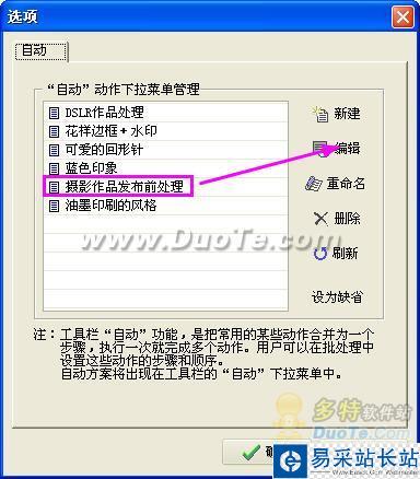 2、在下拉菜單中選擇“自動動作菜單設置”,假如我們要去掉照片EXIF信息,選擇“攝影作品發(fā)布前處理”,按“編輯”按鈕,見圖2。