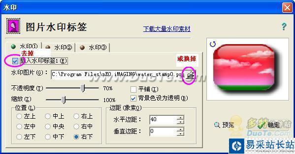 4、如果我們要去掉LOGO水印,可以選擇“花樣邊框+水印”,在出現(xiàn)的對話框中,點擊“水印”前面的“√”,使它變成“X”,然后“確認”。見圖4。