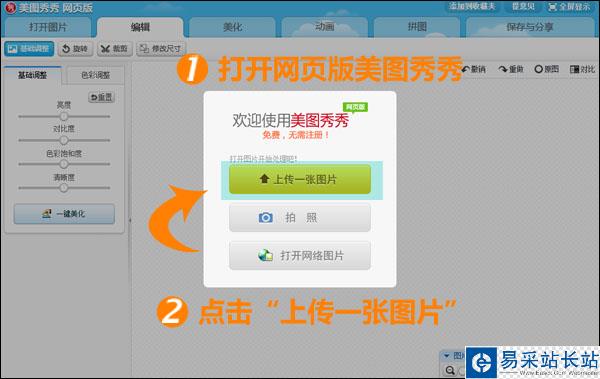 1.打開美圖秀秀網頁版(http://xiuxiu.web.meitu.com/),點擊“上傳一張圖片”,上傳需要美化的照片。