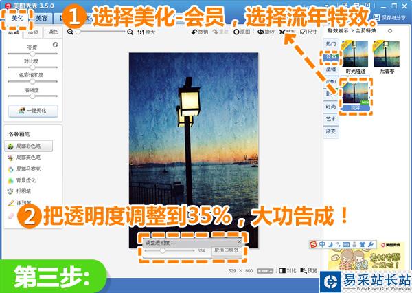 3、最后在“美化”菜單下,選擇“會員”分類,選擇“流年”特效,并把透明度調整到35%,適當調節一些自己喜歡的色調就大功告成啦~