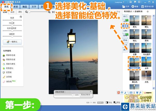 1、在軟件下打開待處理的照片,進入“美化”菜單下,選擇“基礎”分類,選擇 “智能繪色”特效,提升照片色彩度。