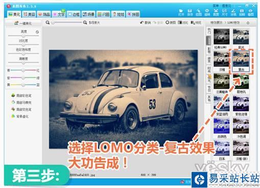 第三步:再點擊使用“LOMO”標簽中的“復古”特效一次,效果就完成啦。