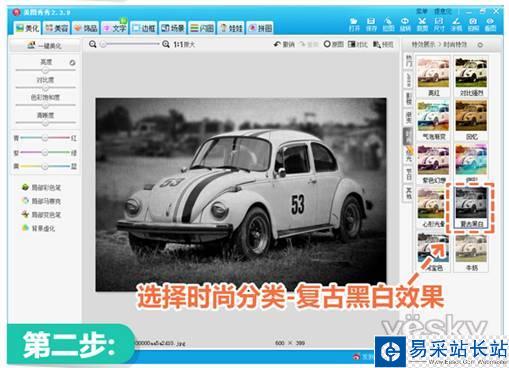 第二步:在“時尚”標簽里,選擇“復古黑白”特效。
