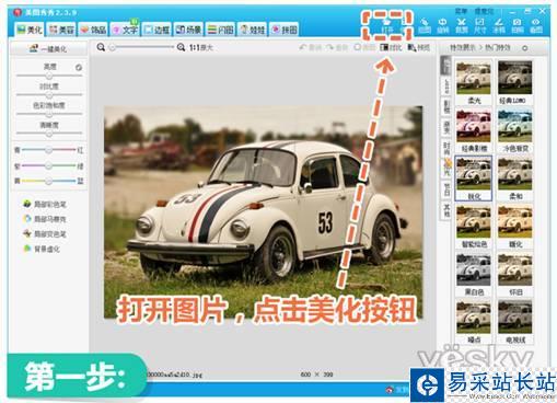 第一步:用美圖秀秀打開要處理的圖片后,點“美化”菜單。