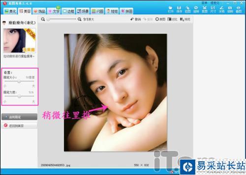 3、皮膚狀況處理好后,再選擇“瘦臉瘦身”的功能對(duì)人物臉型微整,調(diào)整好畫(huà)筆的大小和力度,如圖4所示,將畫(huà)筆稍微往里推,這樣一來(lái)就起到了修容的效果了。